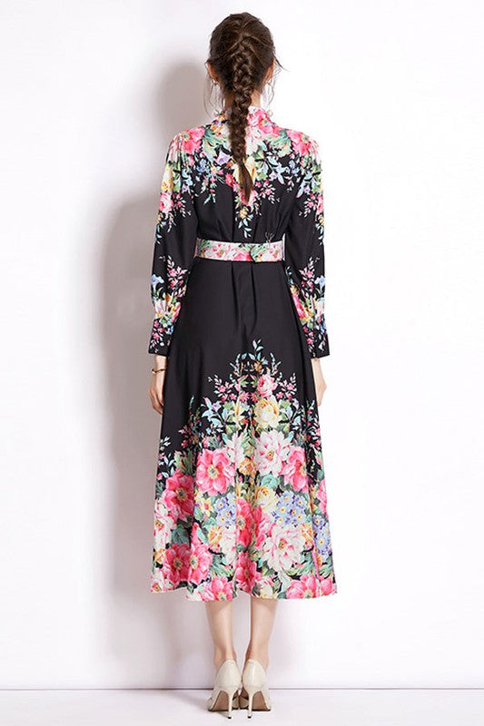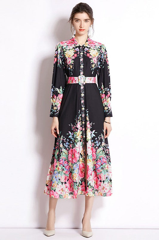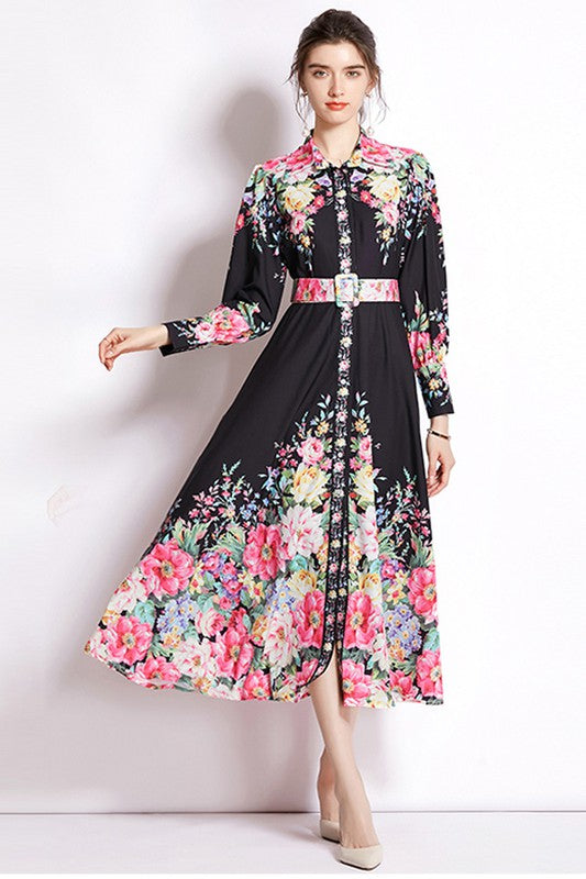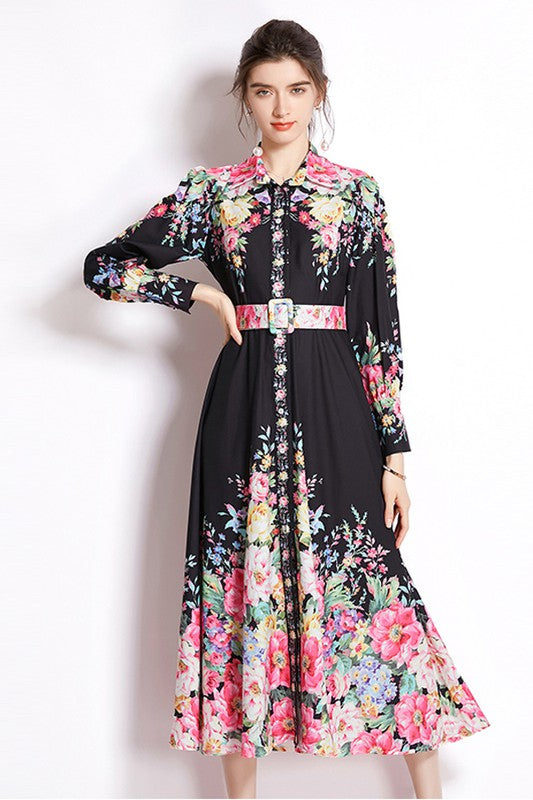 Details-floral multi print, front button, long sleeves, A-line style skirt with a belt look,side zipper