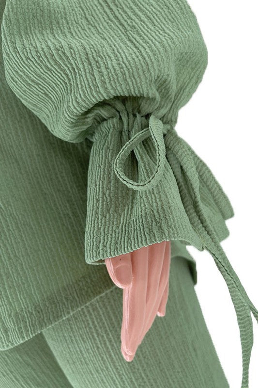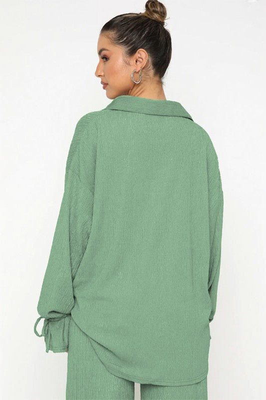 Sexy casual 2pcs set, long sleeves, shirt top front button, elasticized waist pants, pants cut off side look